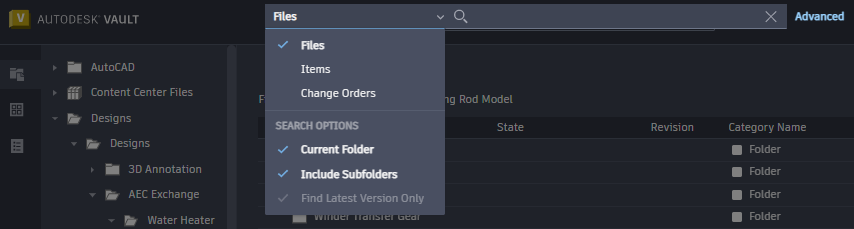 Select the search option - Current folder and/or Include Subfolders or Find Latest Version Only. By default, the "Include Subfolders" option is selected.