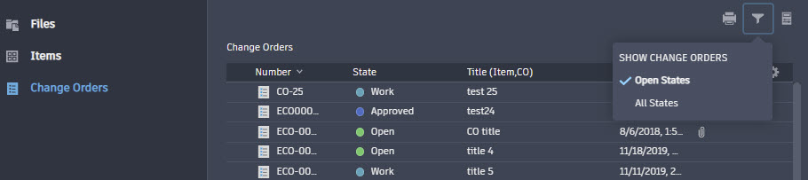 You can filter the view to only show change orders that are in Open state (Create, Open, Work, Review, Approved, Rejected) or select All States to list all change orders including Closed or Cancelled states.