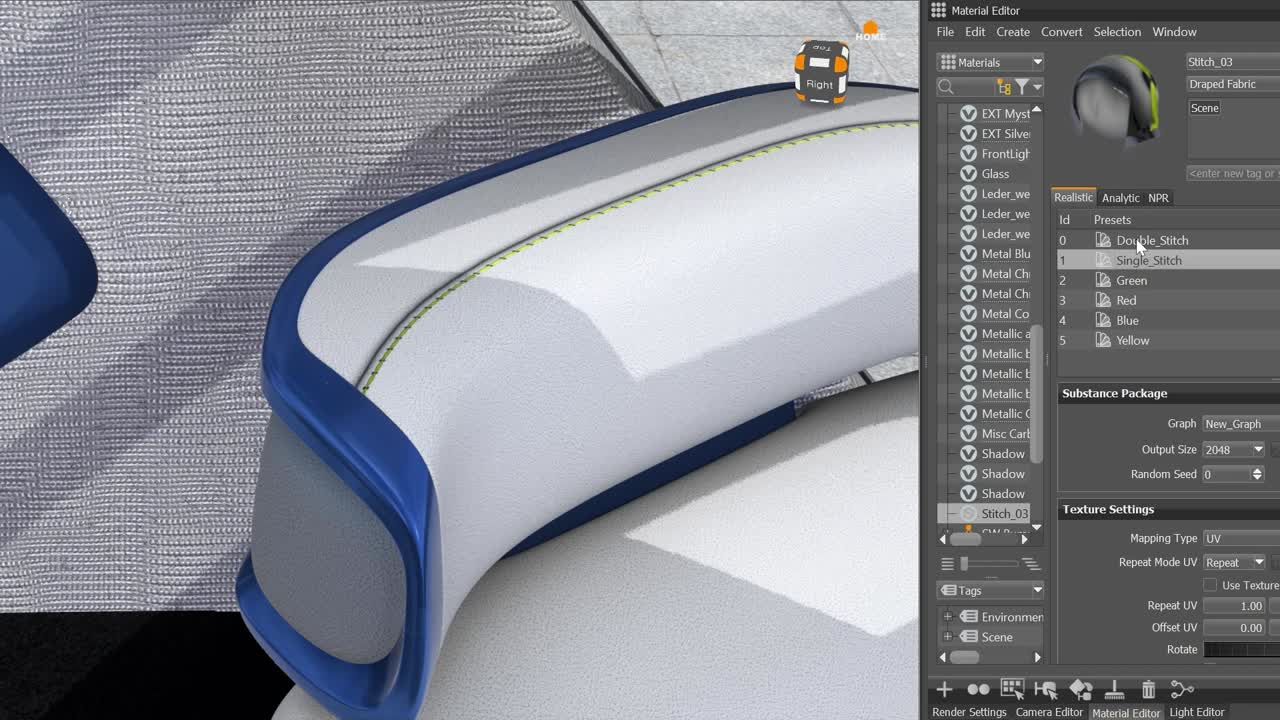 Specifically for the Substance materials, we added a new option. In Adobe Substance Designer it is possible to capture only specific values in Presets. And in the VRED Preferences, it is now possible to decide what happens with these un-captured values, so you can select between Apply & Reset and Apply & Merge. This gives you the possibility to combine different presets, like I can do here, where I can select a double or single stitch and also select different colors presets. When now assigning a material, you can use the drag and drop functionality.