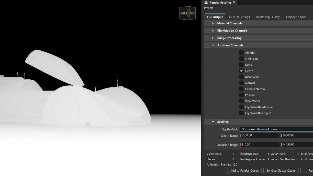 In VRED 2024.2, we added the Settings sub-section to the Renderpasses section and options for generating the depth pass in a linear scale, either using world space (Linear) or within a specified range (Normalized Linear & Normalized Reversed Linear), independently from the camera near and far clipping plane settings (Standard). Use depth of field or fog in post processing. Use Occlusion Range for tweaking contrast of creases in post processing.