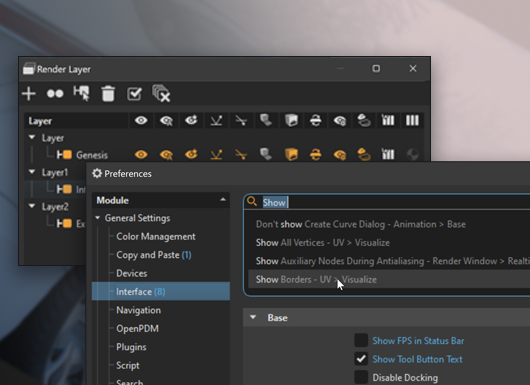 We also improved the UI on some modules like the UV Editor, where you can now scale the windows more dynamically. Also, the Render Layer dialog is now better scalable and changes to icons, instead of text-only when scaled down. This is much better when this window needs to fit into a smaller area for example.