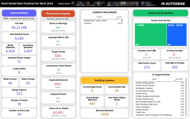You can download a sample Health Dashboard Model Checker checkset XML, a Microsoft PowerBI template, and instructions. This sample will track multiple Revit projects over time. You can also watch a video on this template here: