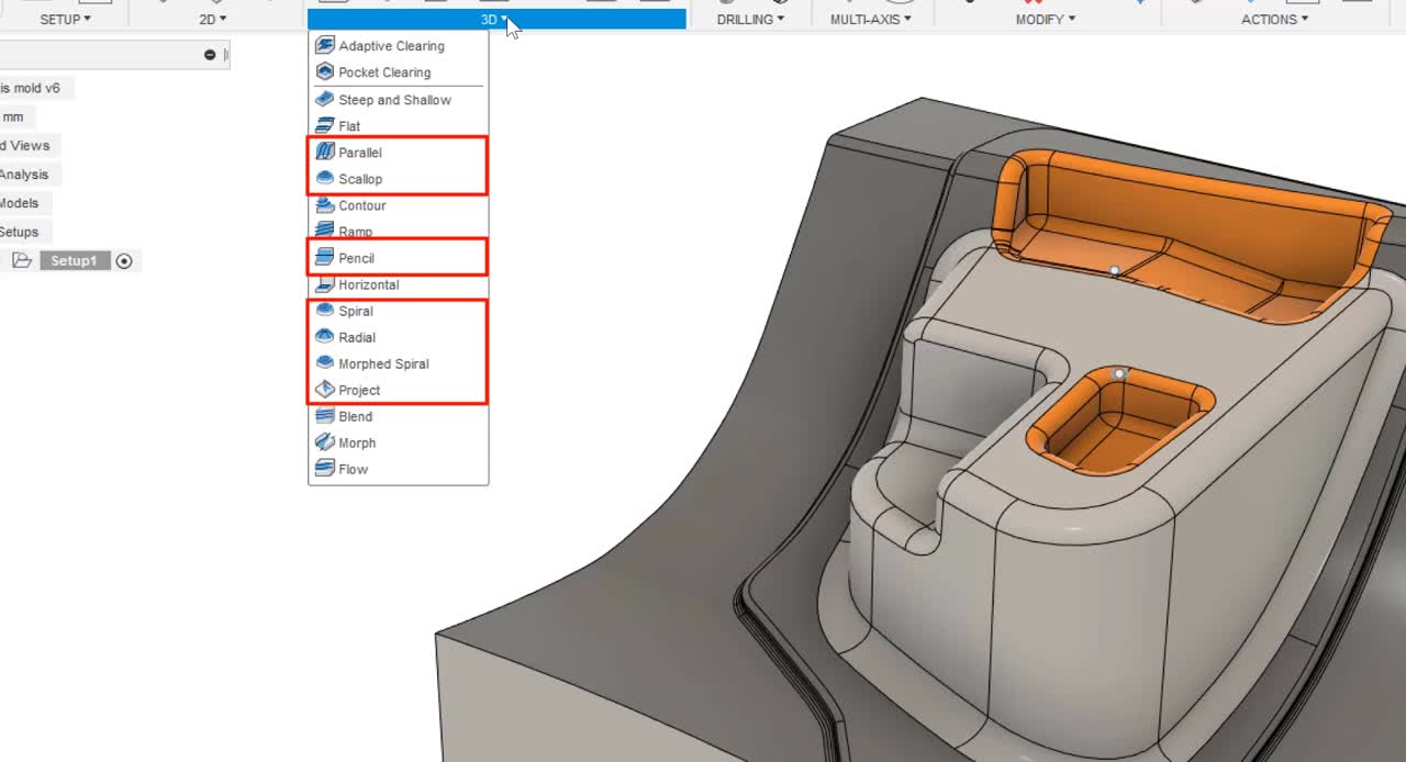 Using the Machining Type option in the Tool tab, you can enhance most 3D toolpaths to use multi-axis machining. Multi-axis controls define the orientation of the tool so that you can machine the part in the most efficient way.